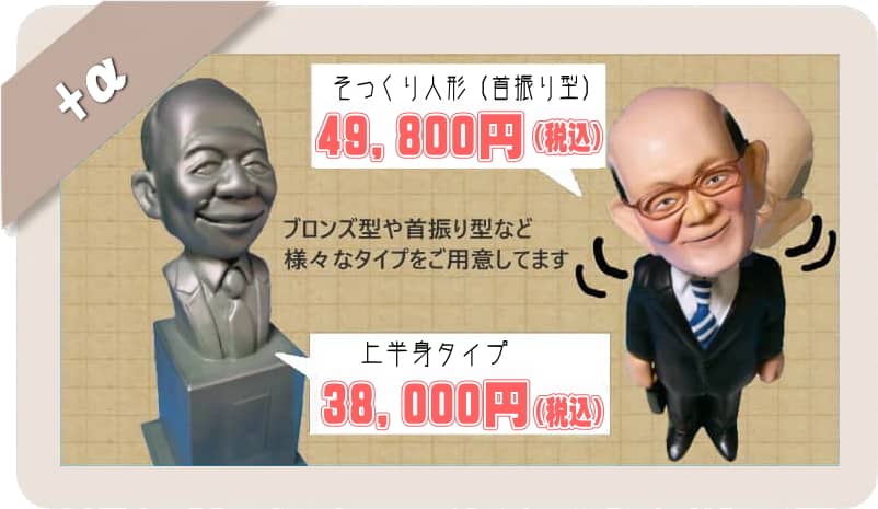 そっくり人形の派生タイプとしてブロンズ人形や首振りタイプをご用意しています。